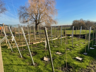 En 2027 on va planter encore 25 pieds de raisins noir Caladoc, on a déjà placé les poteaux, en acier cette fois-ci, car les poteaux en bois pourrissent trop vite.